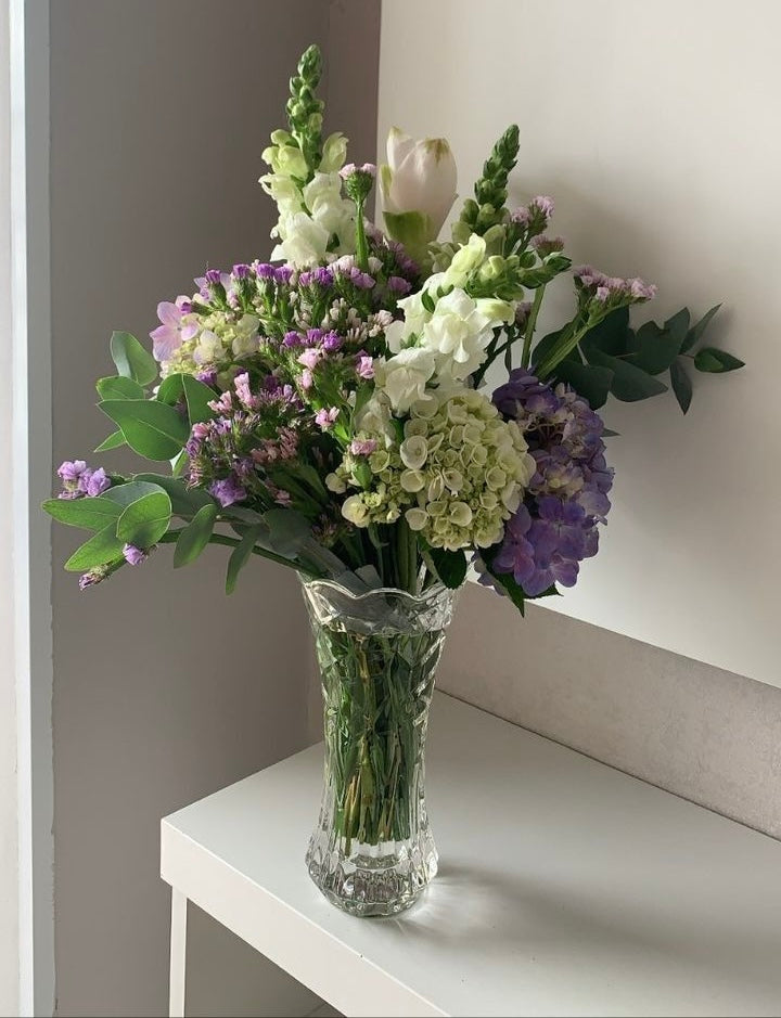 Un bouquet raffiné aux tons violets et blancs, associant hortensias majestueux, mufliers aériens et statice délicat, sublimés par une touche d’eucalyptus. Une composition élégante et moderne, parfaite pour illuminer un intérieur.