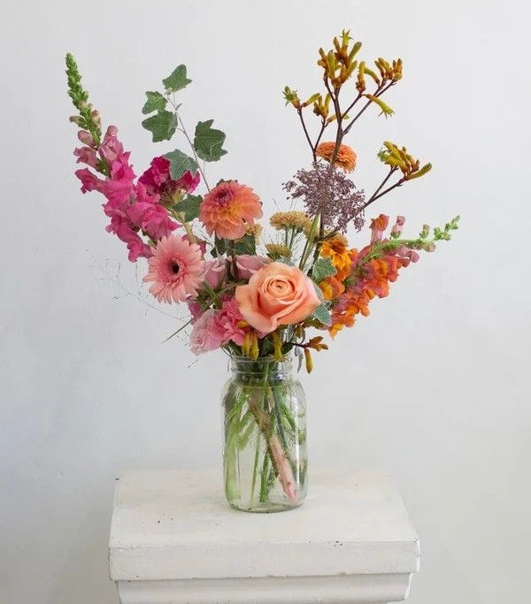 Un bouquet champêtre éclatant aux nuances chaudes, mariant le rose tendre et l’orange flamboyant. Composé de belles fleurs et de feuillages légers, il apporte une touche de soleil et de fraîcheur à tout intérieur. Idéal pour illuminer une journée ou offrir un cadeau vibrant et joyeux.